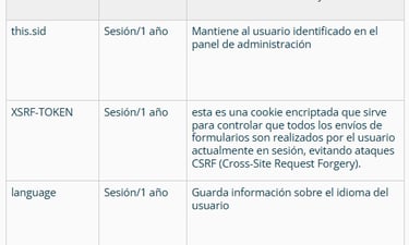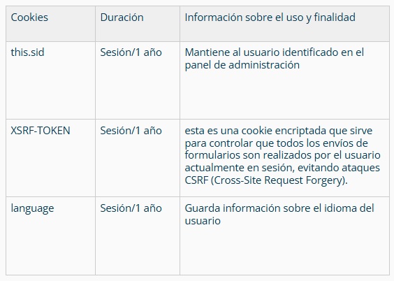 Información detallada sobre las cookies utilizadas por este sitio web