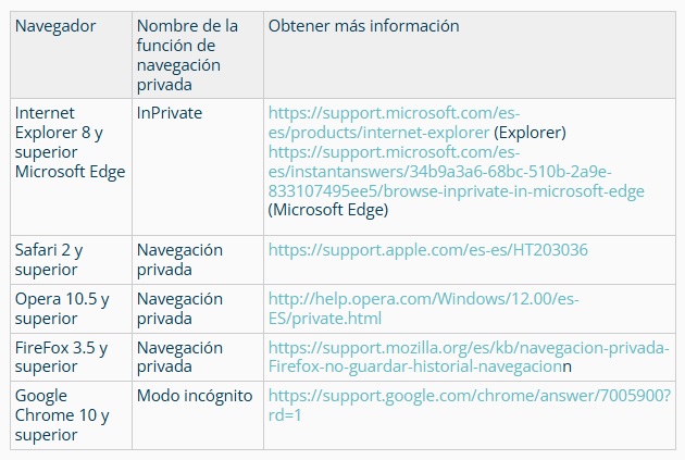 Si desea usar esta web con mayor grado de privacidad y limitando que las cookies queden almacenadas por plazos largos de tiempo, recomendamos que utilice un navegador web que disponga de una opción de navegación “privada”. Puede obtener información sobre esta posibilidad en las páginas de ayuda de los navegadores más comunes: