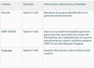 En esta política se incluye información sobre la duración de las cookies; para más información, consulte nuestra política de privacidad, así como la información proporcionada en las políticas de privacidad de los terceros proveedores de funciones web.